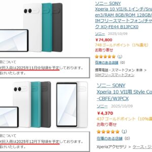 ●ソニーストア Xperia 納期情報。Xperia 10 VIIが全色納期遅延。