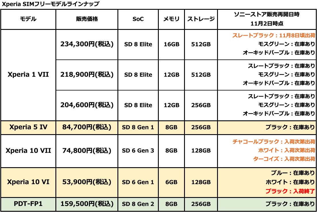 Xperia 1 VII(XQ-FS44) ソニーストア在庫状況(11月2日時点)