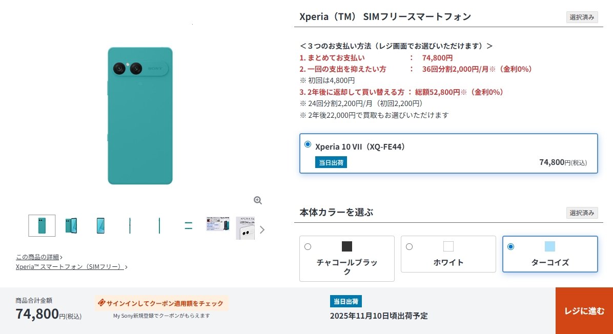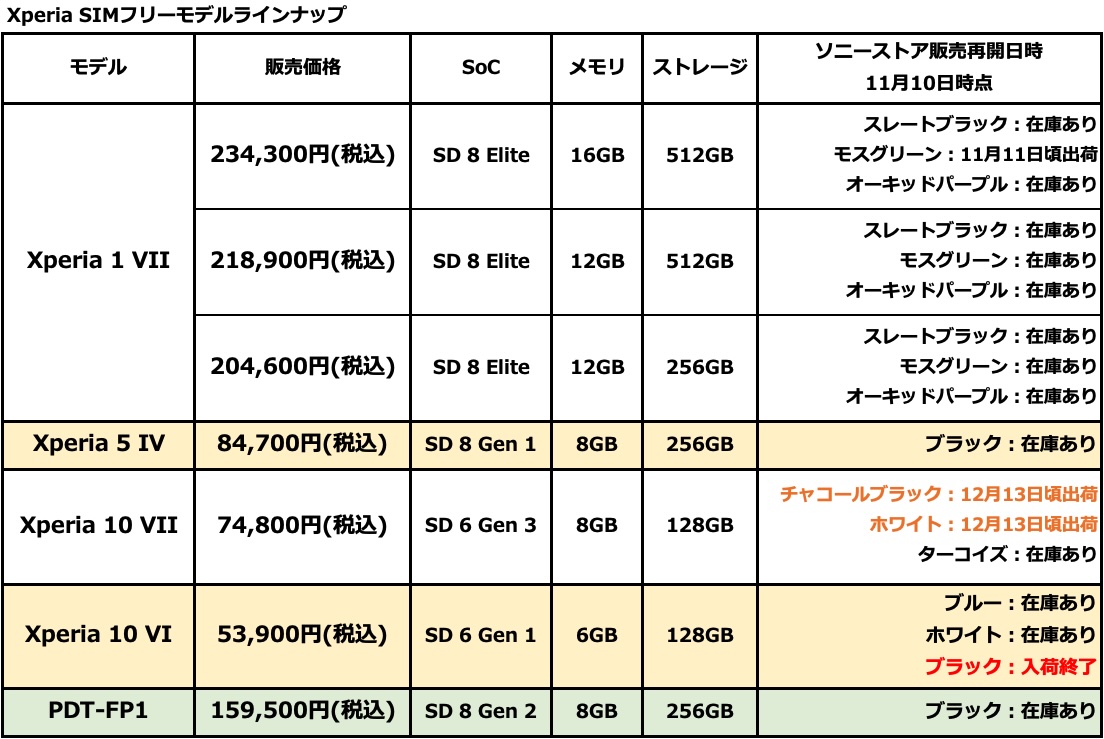 11月10日時点での、Xperia 1 VII(XQ-FS44)Xperia 10 VII(XQ-FE44)を含むソニーストアで販売中のXperia在庫状況は、以上の通り。