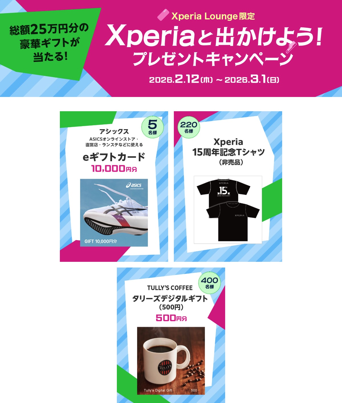 今回、アシックスASICSオンラインストア・直営店・ランステなどに使えるeギフトカード10,000円分、TULLY’S COFFEEが抽選で5名様 タリーズデジタルギフト(500円)が抽選で400名様のほか、Xperia 15周年記念 Tシャツ(非売品)が抽選で220名様に当たる豪華キャンペーン。