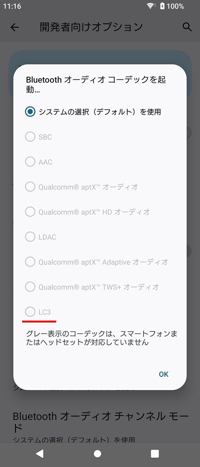 設定をみると「Bluetooth LE Audio」に対応したことを示すBluetoothオーディオコーデックに新しい「LC3」が加わっていた。