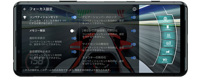 また、ゲームに不要な機能を無効化して誤動作などを防ぐ「コンペティションセット」や、「HSパワーコントロール」機能を使い充電器を繋ぎながらのゲームプレイ時でも端末高温化によるパフォーマンスの低下やバッテリーの劣化を抑えるといった事もできる。