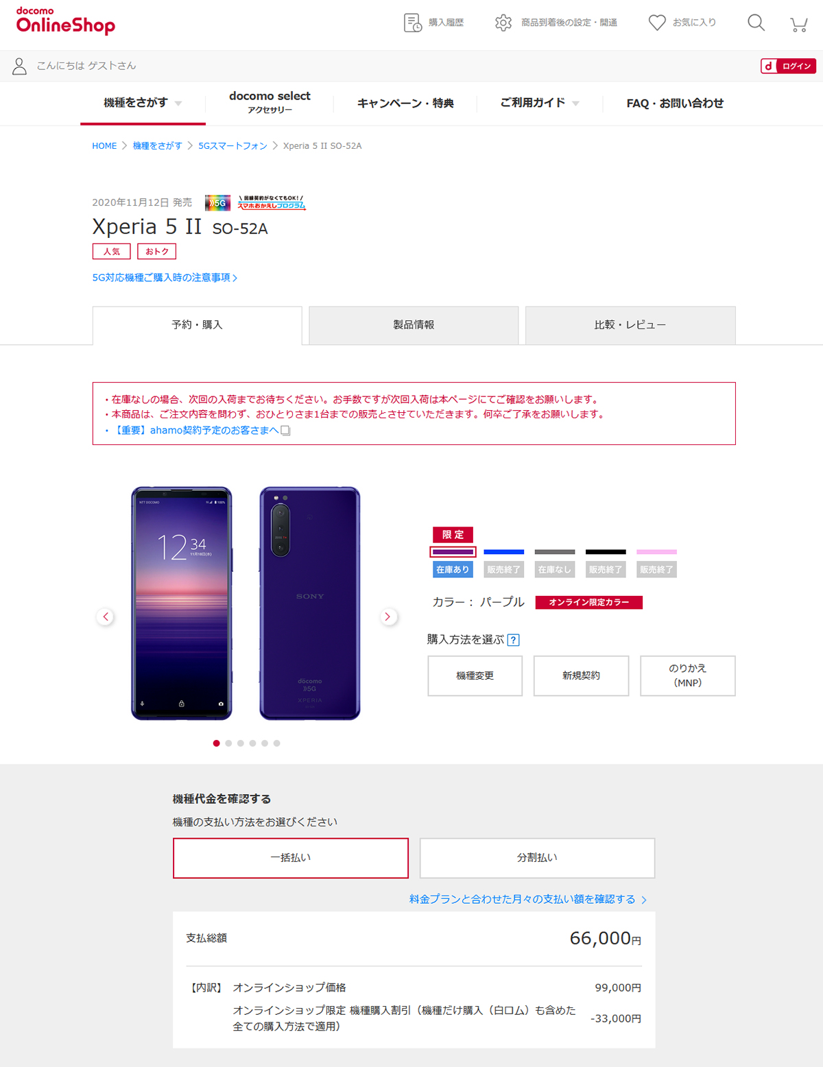 2022年2月23日12時30分に確認したところ、「Xperia 5 II SO-52A」パープルの在庫復活。