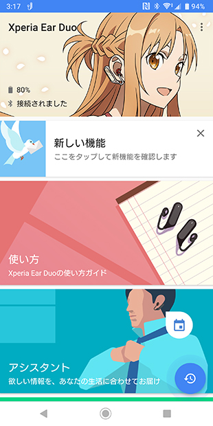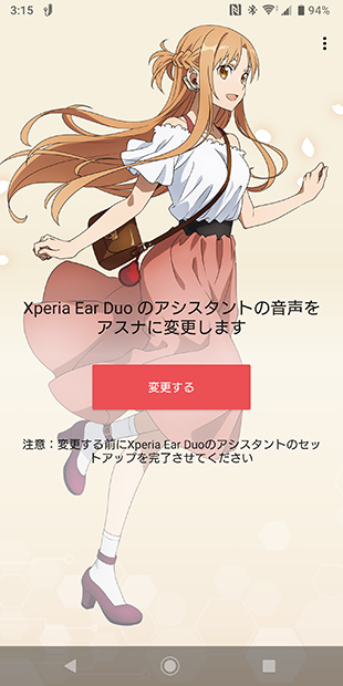 「Xperia Ear Duo(XEA20)」のアプリのトップ画がアスナのイラストに変更になっていて切り替わったことがわかる。