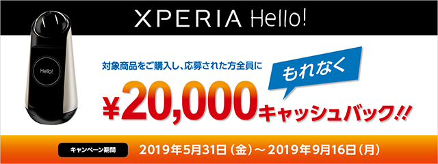 対象機種はコミュニケーションロボット Xperia Hello!(G1209)を購入すると、20,000円のキャッシュバック。
