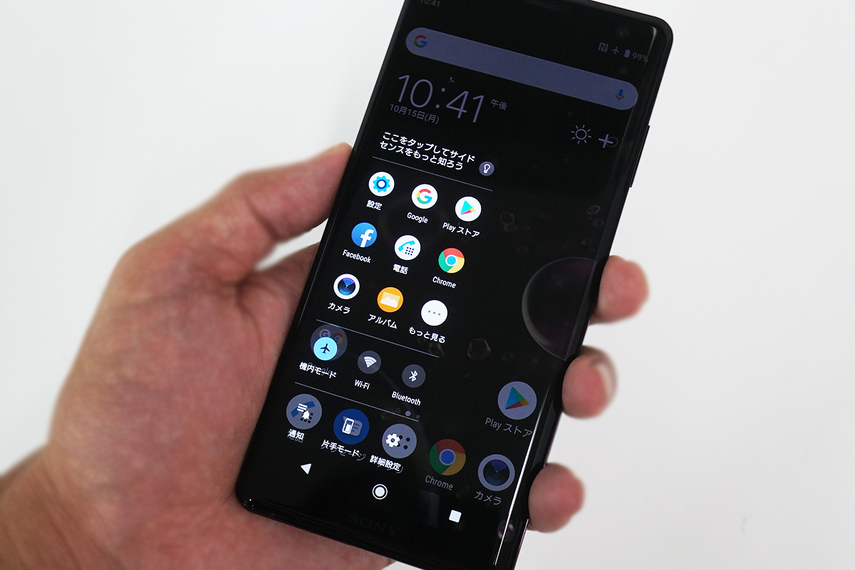左右に加えて上下のベゼルに対するディスプレイの専有面積も増加し、本体サイズをキープしつつ大きい画面の操作しつつ、ディスプレイサイドにはタッチすることアプリを呼び出せたりバック動作として使える「サイドセンス」を備えている。