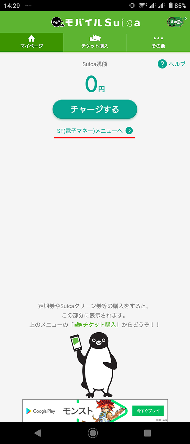 「モバイルSuica」にチャージする場合。
