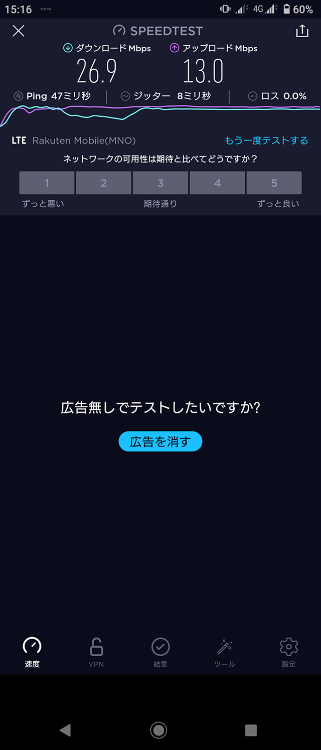 あくまでも楽天回線ではなくて、au回線(800 MHz)のスピードではあるけれど、さすがに対応エリアも広く使い勝手は悪くない。