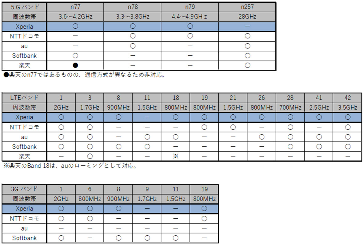 <Xperia 1 II (XQ-AT42)の対応バンド>