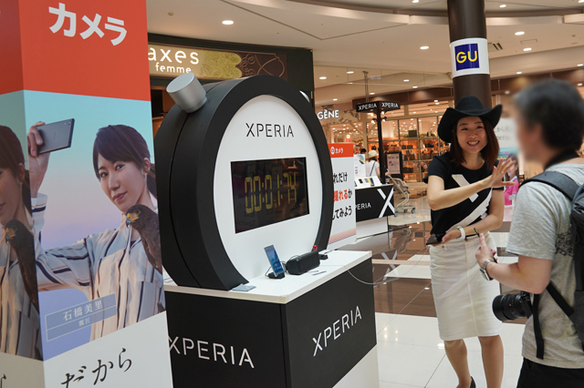 巨大ストップウォッチに向かって自分の持っているスマホと最新のXperiaで競ってどっちが早く撮れるかをXperia GIRLのおねえさんと競う。