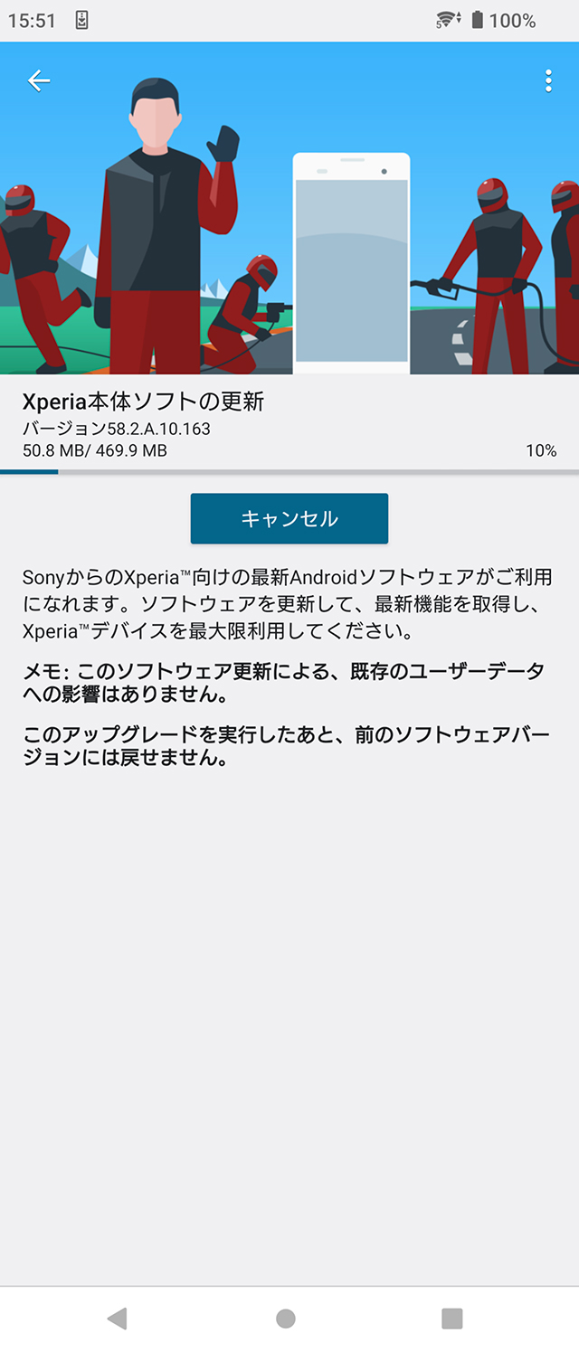 ステータスバーを下にフリックして[ダウンロードしてください]をタップしたのち、「Xperia本体ソフトの更新」よりダウンロードおよび[今すぐインストール]へと勧めていくと、ソフトウェアの更新が行われる。