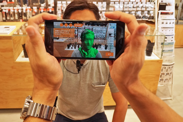 仕上げの立体造形とするために、顔のまわりでXperiaをなめるように移動させていくと、顔の特徴をおさえるためにポリゴン処理されていき、テクスチャマッピングされた顔の画像が3Dデータとして作成される。