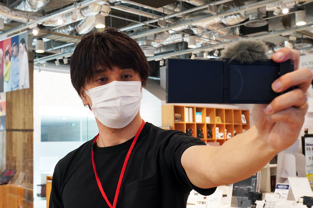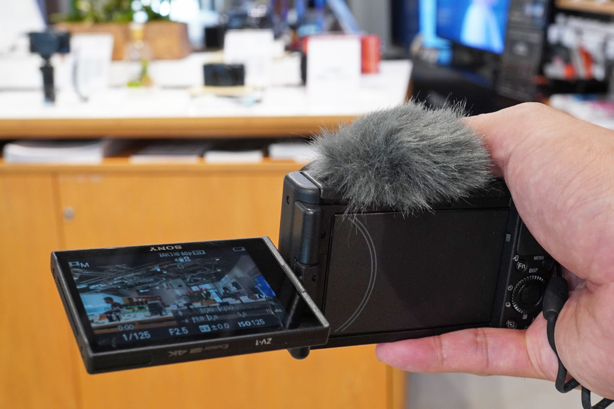 「VLOGCAM ZV-1」は、マイク性能が非常に優秀なうえに、ウインドスクリーンまで付けられる。