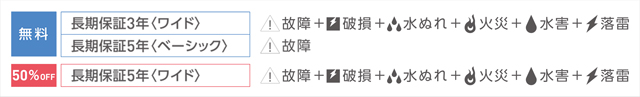 故障の保証「長期保証<ベーシック>」に加えて、破損・水ぬれ・火災の保証まで広範囲に対応する「長期保証」の手厚いサービス。