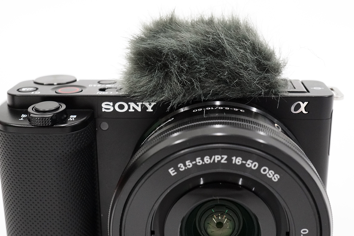 「ZV-1」と同じく、カメラの上の面にあるアクセサリーシューにウインドウスクリーンを装着すると、ちょうどマイク部分が覆われるようになっている。