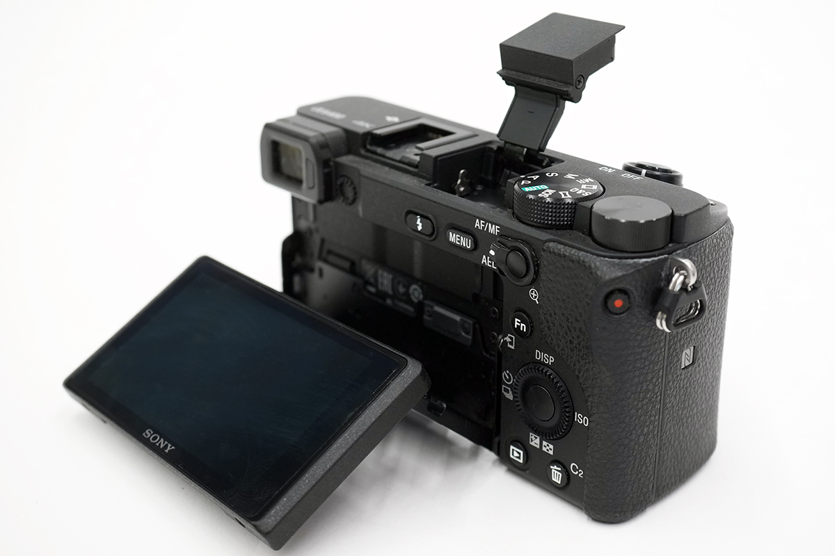 α6400はチルトモニターでありながらひっくり返して自撮りもできるようなっているものの、EVFとアクセサリーシューにおもいっきり干渉するので若干強引なところもある。